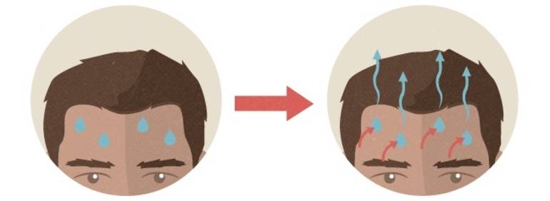 Через поры на коже выделяется жидкость, которая затем быстро испаряется. Это позволяет быстро избавиться от лишней энергии и охладить тело, нормализовав температуру. Некоторые животные инстинктивно пытаются усилить этот процесс — например, собаки в жаркую погоду открывают рот и высовывают язык.