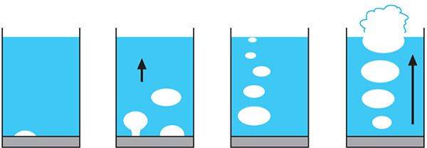 Во время кипения происходит интенсивное образование пара, образуется огромное количество пузырьков. Когда пузырьки достигают поверхности жидкости, они лопаются и пар выходит в окружающую среду.