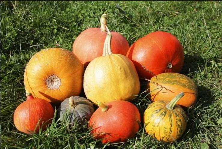 Плоды у тыквы круглые, жёлтые и оранжевые.