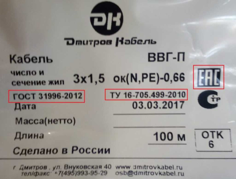 На самом деле о качестве кабеля не столько говорит наличие отметки ГОСТ, сколько наличие отметки EAC. Это знак обращения, обозначающий согласованность товара с требованиями Таможенного Кодекса Евразийского Экономического союза.