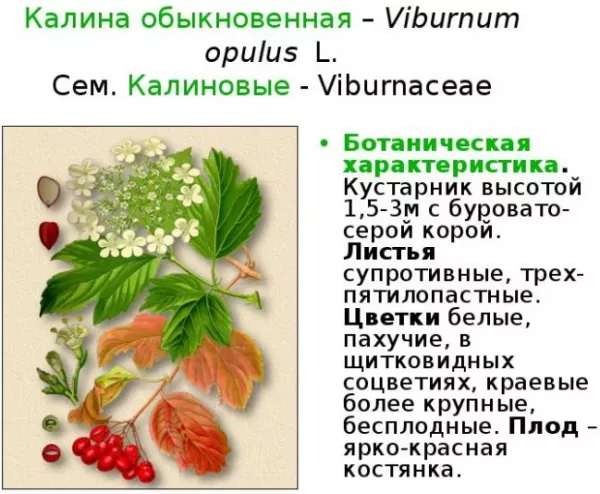 | Калина | Серовато-коричневый, растрескавшийся. | Его можно использовать в медицинских целях. | Мощный и разветвленный. |