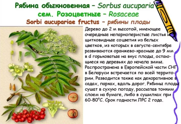 В рябине среди полезных веществ содержатся йод, железо, сорбит, пектин и прочие. Свойства плодов используются при лечении авитаминоза. Рябина также помогает при отсутствии аппетита и камнях в почках. Ее настои обладают потогонным действием и применяются для полоскания горла.