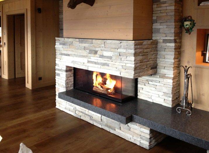 : дизайнеры «пристроили» к камину массивный дымоход, а сам его обложили материалами, способными аккумулировать тепло. То есть декоративное обрамление камина выполняет обогревательную функцию: аккумулирует и отдает в помещение тепло.