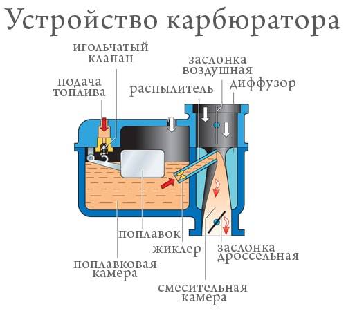 Дроссельная заслонка служит для регулировки количества поданного топлива в ДВС. Диффузор — это специальное трубчатое устройство, через которое в двигатель подается воздух. Жиклером называют специальный цилиндрический механизм, в котором сделаны отверстия, через которые в камеру сгорания поступает топливо. Количество топлива зависит от диаметра отверстий в жиклере. В поплавковую камеру, по специальной трубке, из бензобака подается топливо: если бензина много — то поплавок поднимается и иголкой перекрывает подачу бензина; мало топлива — поплавок опускается, иголка открывает отверстие и подача бензина возобновляется.