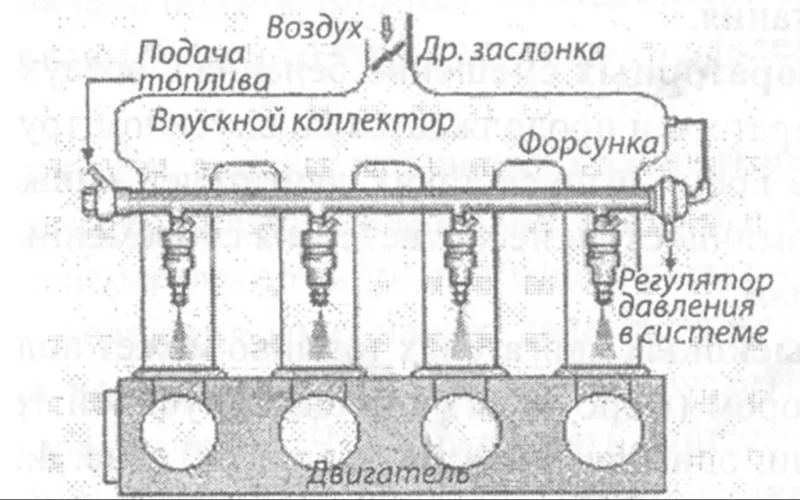Общая схема впрыска проста. При включении зажигания или стартера электрический насос подаёт бензин в фильтр тонкой очистки, далее в топливную рампу с электромагнитными форсунками. Бензонасос постоянно качает большой объём топлива в расчете на максимальные нагрузки двигателя. На режимах холостого хода расход топлива очень маленький поэтому регулятор давления сбрасывает излишки топлива назад в бензобак.