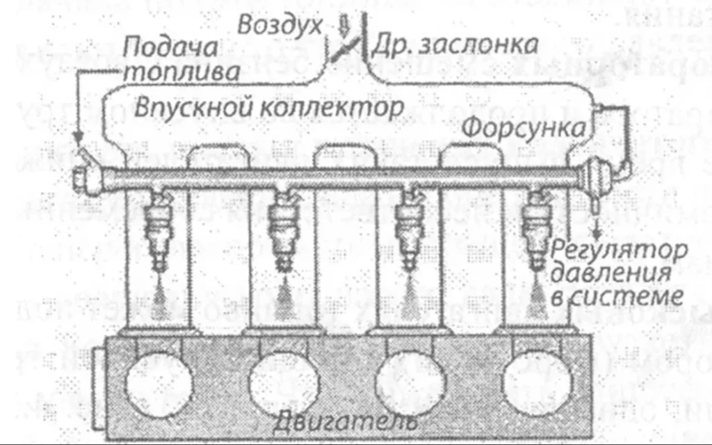 Общая схема впрыска проста. При включении зажигания или стартера электрический насос подаёт бензин в фильтр тонкой очистки, далее в топливную рампу с электромагнитными форсунками. Бензонасос постоянно качает большой объём топлива в расчете на максимальные нагрузки двигателя. На режимах холостого хода расход топлива очень маленький поэтому регулятор давления сбрасывает излишки топлива назад в бензобак.