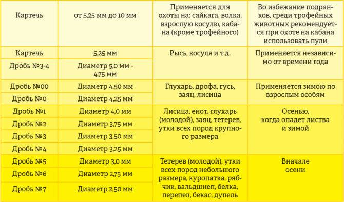 Чем больше диаметр баллистического снаряда, тем меньше свинцовых боеприпасов вместится в патрон, но тем выше будет кучность стрельбы и мощность выстрела. Крупная дробь используется в основном для отстрела млекопитающих внушительной массы, маленькая — подойдет для охоты на птиц. В таблице перечислен размер по номерам (показатели актуальны для тех патронов, которые изготавливаются в России):