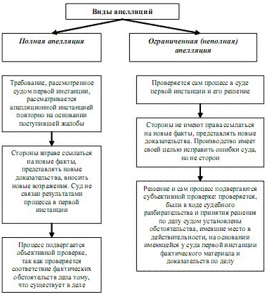 Существует два типа апелляции: полная и неполная. Полная апелляция подразумевает рассмотрение всех обстоятельств дела с учётом всех фактов, в том числе тех, которые не были представлены ранее, на заседаниях нижестоящего суда. Суд сам изучает дело и выносит по нему решение, не отсылая суду, который занимался этим делом раньше.