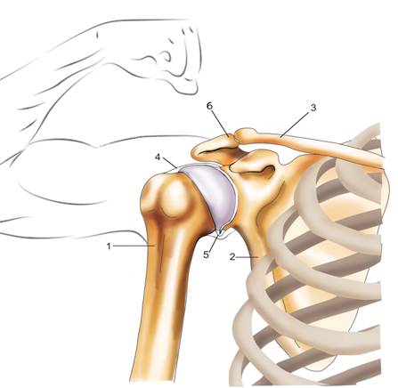 Строение плечевого сустава. (1) плечевая кость, (2) лопатка, (3) ключица, (4) суставная капсула, (5) складки, (6) акромио – ключичный сустав.