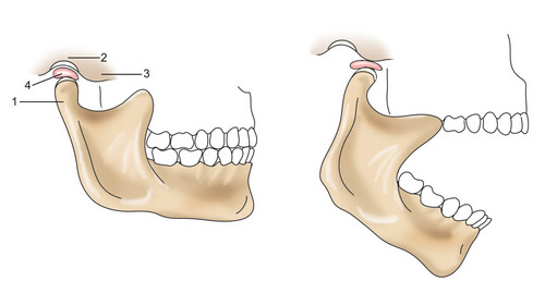 Строение височно-нижнечелюстного сустава. челюсть, (2) нижнечелюстные ямки, (3) бугорок, (4) внутрисуставной хрящевой диск.