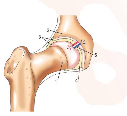 Строение тазобедренного сустава. (1) головка бедренной кости, (2) вертлужная впадина, (3) эластичный хрящ, (4) синовиальная жидкость, (5) сосуды внутри сустава.