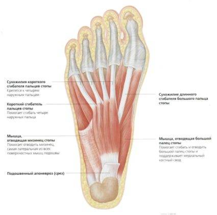 Наиболее важным образованием можно выделить на стопе длинную или продольную связку подошвы. Она берет свое начало от пяточной кости, идет до самого основания плюсневых. В течение всего пути от связки отходит много волокон, способствующих укреплению свода стопы, поддержанию его в правильном положении на протяжении всей жизни. Есть другие виды связок стопы, они небольшие, но необходимые для укрепления свода. За счет этого стопа способна нести на себе статические, динамические нагрузки.