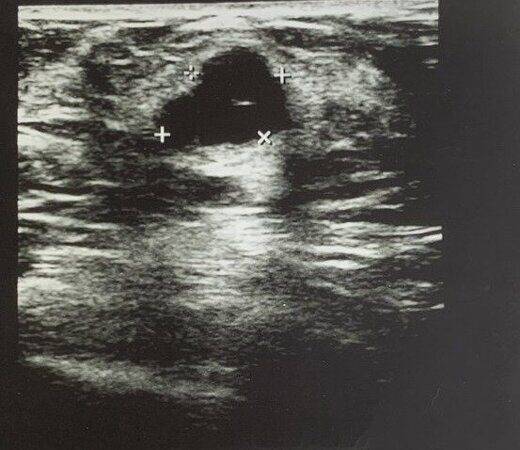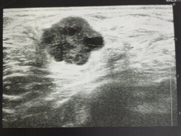 Фото УЗИ опухоли одной и той же пациентки с интервалом 4 месяца. Первый раз врачом УЗИ был проигнорирован неровный контур опухоли и её большой вертикальный размер. Через 4 месяца был замечен рост образования, но снова проигнорирован вертикальный размер и неровный контур. На всех этих снимках УЗИ – рак молочной железы.