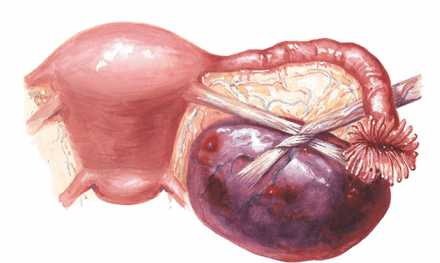 - Синдром сдавления соседних органов/сосудов. Растущее овариальное образование сдавливает мочевой пузырь, что проявляется дизурическими нарушениями: учащение мочеиспускания, болезненность, трудности при опорожнении мочевого пузыря. Давление на прямую и сигмовидную кишку провоцирует запоры и боли, отдающие в задний проход. Сдавление кровеносных сосудов в полости таза ведет к застою крови в венах нижних конечностей и таза и развитию их варикозного расширения.