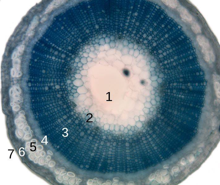 Рисунок 2: Стебель 1 – сердцевина, 2 – протоксилема, 3 – вторичная ксилема, 4 – первичная флоэма, 5 – склеренхима, 6 – кора, 7 – эпидермыs