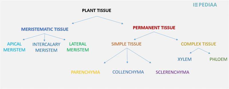 Постоянную ткань растений можно разделить на две категории; простая постоянная ткань и сложная постоянная ткань. Простая постоянная ткань состоит из клеток аналогичного типа. Три типа простой постоянной ткани – это паренхима, колленхима и склеренхима. Ткань паренхимы состоит из тонкостенных шаровидных живых клеток. Большинство клеток растений – это клетки паренхимы. Колленхима состоит из толстостенных живых клеток. Клетки склеренхимы состоят из толстых вторичных клеточных стенок.