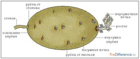 Разберем строение созревшего клубня. Для этого обратимся к наиболее распространенному представителю клубневых растений – картофелю: