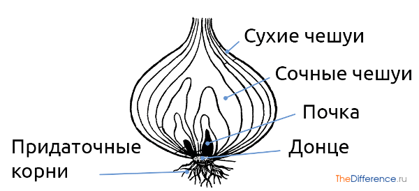 Луковица также имеет все признаки побега, однако определенные особенности строения и определяют различие между ней и клубнем.