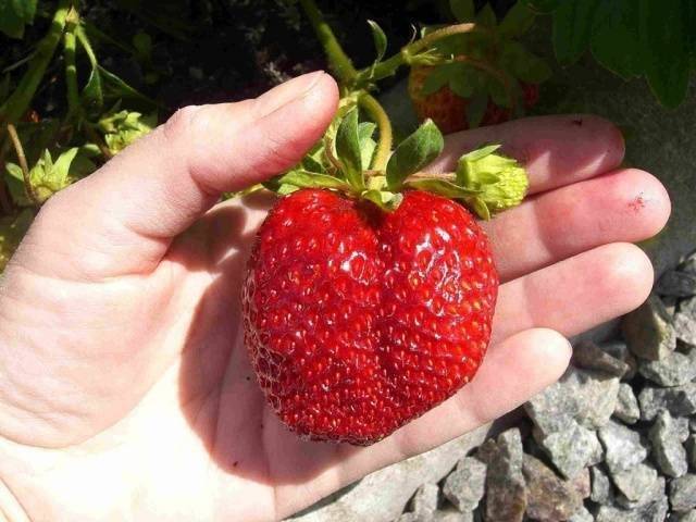 Ягода крупная и нежная, внутри белая сочная. Плоды тяжёлые поэтому в основном, лежат на почве, и им требуются подставки или мульчирование грунта. Самой крупной ягодкой считается, сорванная в американском штате Кент в 1983 г. Её вес был чуть больше 230 граммов, правда оказалась не очень сладкой.