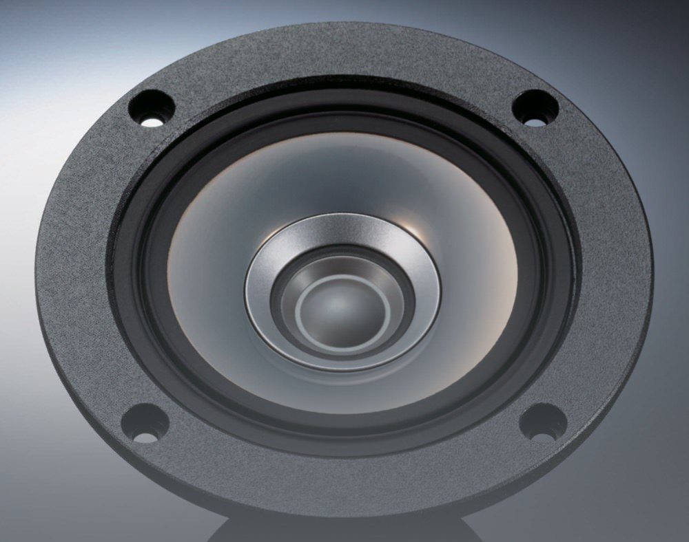 Полочная модель использует твитер с титановой мембраной и СЧ/НЧ-динамик с бумажным диффузором. Вообще динамик довольно интересный, его подвес широкий, рифленый и в основе своей матерчатый. Бумажный диффузор покрыт специальным составом. Пылезащитный колпачок выполнен в виде пули. Конструкция кроссовера использует наработки от топовой линейки Magellan. Порт фазоинвертора находится на задней стенке колонки.