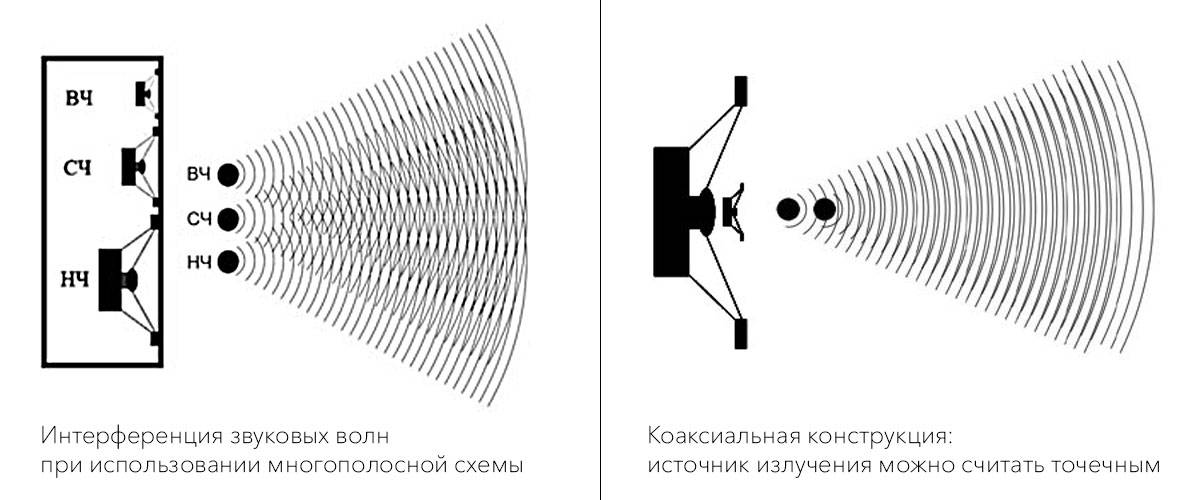Коаксиальная конструкция динамиков, предполагающая размещение твитера на акустической оси низкочастотного динамика, помогает решить эту проблему. Его можно назвать неким промежуточным вариантом между обычной многополосной системой и широкополосным излучателем: кроссовер в колонке по-прежнему присутствует, но источником излучения можно считать точечный.