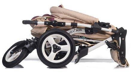 - Большие надувные колеса позволят гулять где угодно. Можете даже заехать на пляж с галькой. Коляска проедет мягко и не побеспокоит ни вас, ни малышей. Амортизаторы на всех колесах смягчат путь, а поворотные передние колеса на это время вы легко зафиксируете.