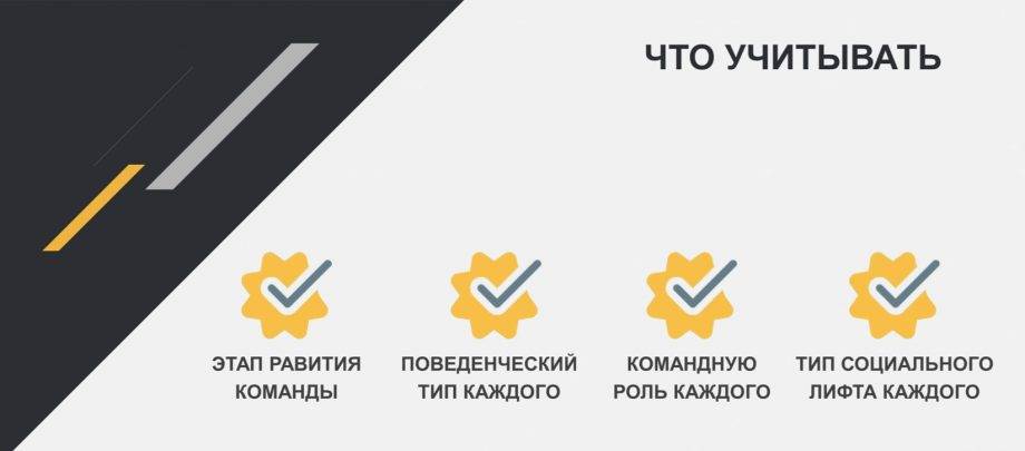 При формировании команды и когда она уже сформирована, важно учитывать четыре параметра: