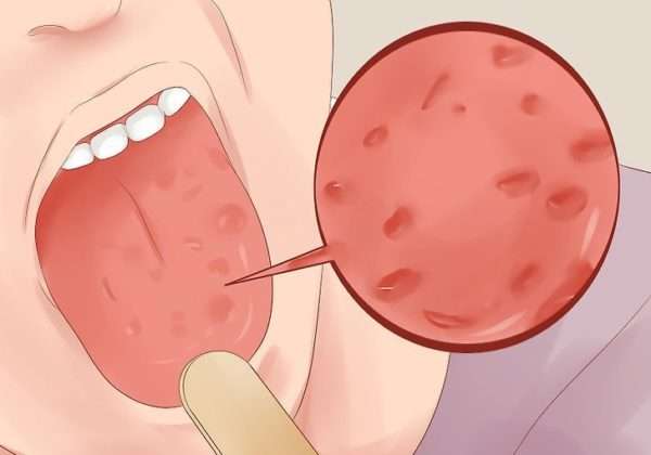 Характерно отсутствие ангины. Возможны катаральные явления, малиновый язык, но не наблюдается таких выраженных проявлений как при скарлатине.