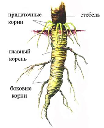 Внешнее строение корня представлено основным, боковыми и придаточными корнями. Основной — наиболее крупный, толстый, является базовым, развивается из зародышевого семени. От него ветвятся более мелкие многочисленные боковые отростки. Придаточные – это воздушные вспомогательные, которые забирают питательные вещества, воду из окружающего воздуха. Они могут располагаться на стебле или листьях.