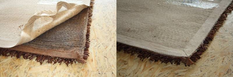 Важно! Ковер более удобен с точки зрения чистки — его можно вытряхнуть на улице или сдать в химчистку. Если ковровое покрытие изготовлено из натуральной или искусственной шерсти, то основание ковролина может быть представлено как классическим исполнением, так и прорезиненной поверхностью