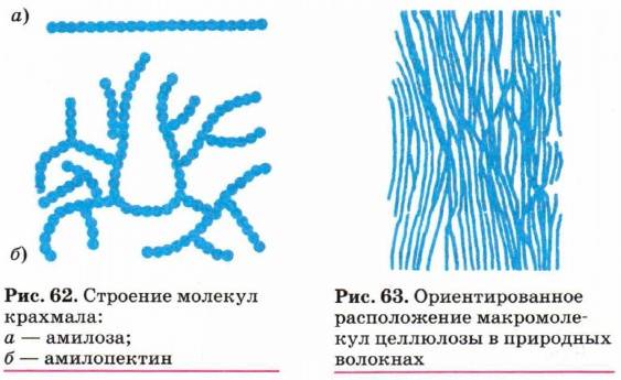 Структурные звенья крахмала и целлюлозы построены по-разному. Если звено крахмала включает остатки α-глюкозы, то целлюлоза — остатки β-глюкозы, ориентированные в природные волокна (рис. 63).