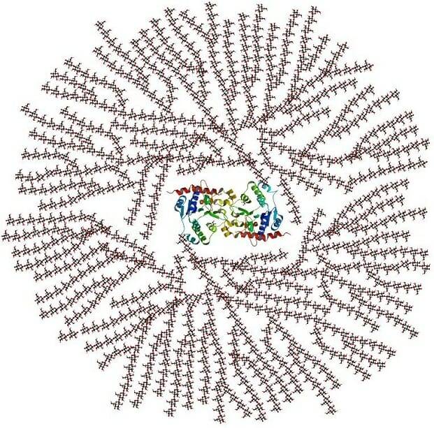 Вероятно, самый важный полисахарид для хранения на планете, гликоген и крахмал производятся животными и растениями соответственно. Эти полисахариды образуются из центральной начальной точки и спирально наружу из-за их сложных структур ветвления. С помощью различных белков, которые прикрепляются к отдельным полисахаридам, большие разветвленные молекулы образуют гранулы или кластеры. Это можно увидеть на изображении ниже молекул гликогена и связанных белков, которые видны в середине.