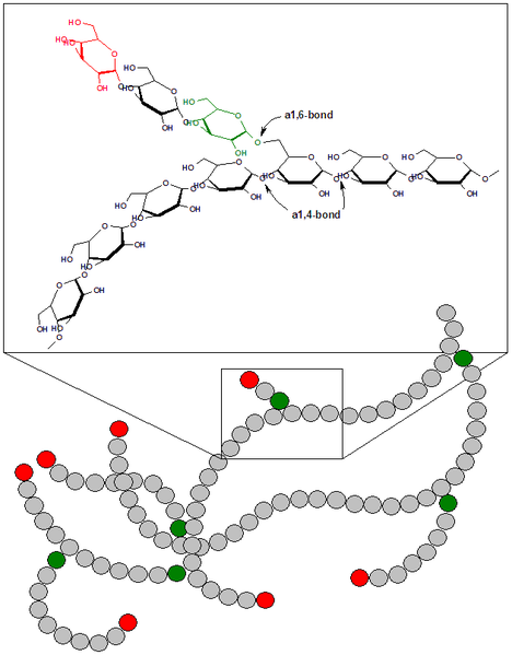 Единственная разница между крахмалом и гликогеном – это количество ответвлений, приходящихся на молекулу. Это вызвано тем, что разные части моносахаридов образуют связи и разные ферменты, действующие на молекулы. В гликогене ветвь встречается каждые 12 или около того остатков, в то время как в крахмале ветвь встречается только через каждые 30 остатков.