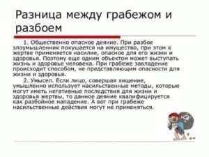 Таким образом, каждый из этих видов преступлений имеет свои особенности и причины, отличающие их друг от друга. Ответственность за совершение разбоя, грабежа или кражи определена в Уголовном кодексе РФ и зависит от тяжести преступления, обстоятельств совершения и других факторов. Все эти преступления предусматривают определённые меры наказания, включая лишение свободы, штрафы и иные санкции.