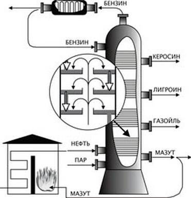Процесс перегонки нефти проводится в специальных колоннах и является непрерывным. В едином технологическом процессе происходит испарение и фракционирование дистиллятов. Нефтяные пары поднимаются в верхнюю часть колонны, где охлаждаются и конденсируются на специальных тарелках, которые разделяют верхнюю часть колонны.