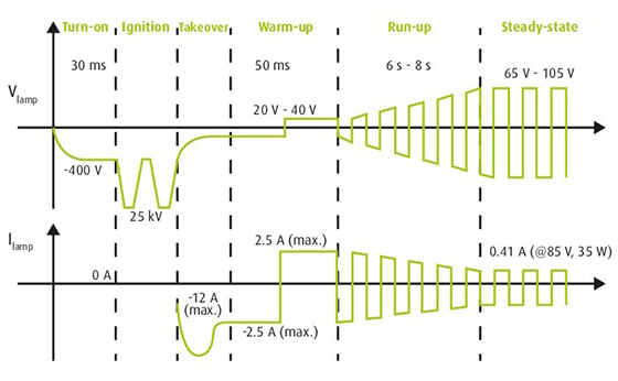 Минусом ксенона, кроме прочих, является тот факт, что для включения таких ламп недостаточно привычного выключателя (реле). Их необходимо разжигать (типа, как костер), а на это необходимо время. Диаграмма розжига ксенона выглядит примерно так.