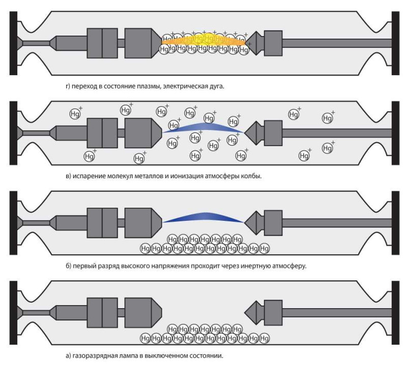Сегодня существуют ксеноновые лампы, внутри которых имеются пары ртути. Такие источники света отличаются бело-голубым свечением. Вследствие конструктивных особенностей плазменное вещество светится и у катода, и у анода.