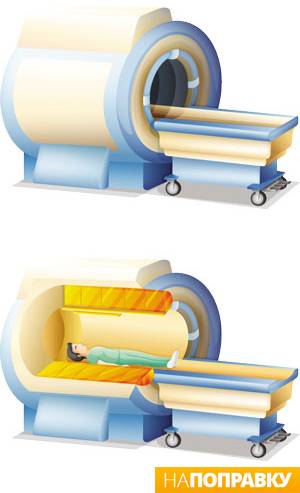 Аппарат магнитной томографии представляет собой цилиндрическую капсулу, внутри которой создается электромагнитное поле. Пациент помещается на диагностический стол внутри этого поля. Датчики аппарата регистрируют информацию и передают ее на компьютер, который соединен с аппаратом.