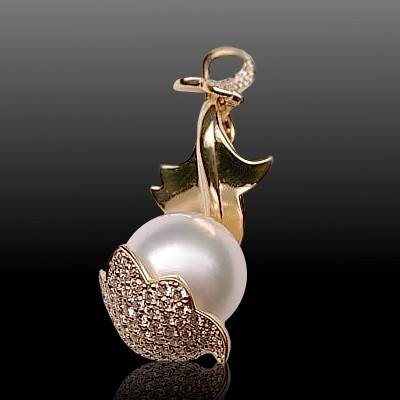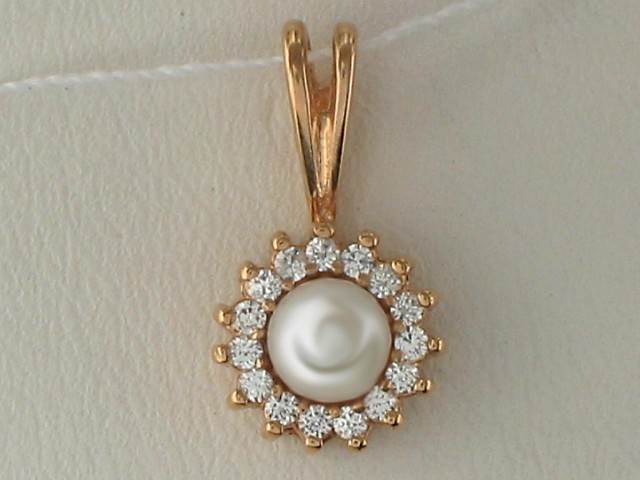 Второеместо занимает не менее красивый кулон из розового золота с жемчужиной в центре, вокруг вставлены белые цирконы: