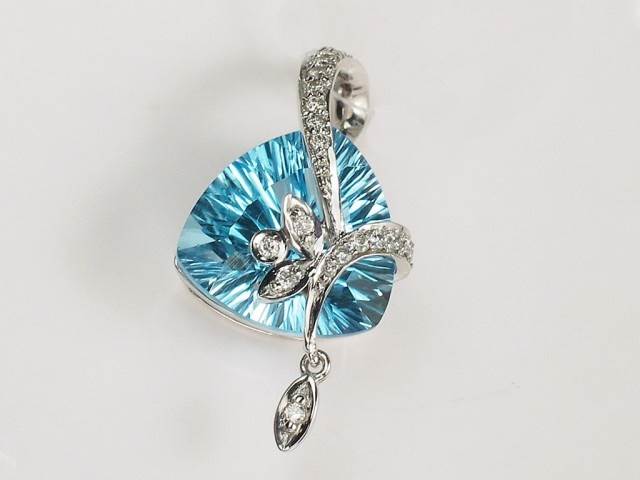 На первое место я решил поставить вот этот. Кулон из белого золота с голубыми топазами и маленькими бриллиантами, очень красиво смотрится и играет в лучах солнечного света: