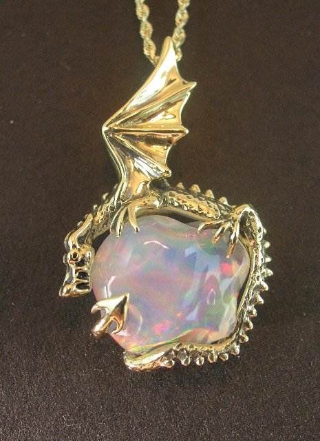 Девятое место досталось красивому дракону из жёлтого золота с халцедоном в центре: