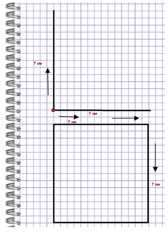 Ставим точку. Помним, что у квадрата все стороны равны. Откладываем вверх 7 см, вправо – 7 см. Чертим противоположные стороны по 7 см.