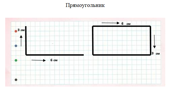Ставим точку. Вверх – 3 см, вправо – 6 см. Помним, что противоположные прямоугольника стороны равны. Чертим их – 6 см и 3 см.