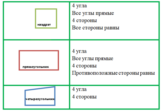 – Что же мы узнали о квадрате и прямоугольнике (у квадрата 4 угла и 4 стороны, которые равны, у прямоугольника 4 угла и 4 стороны противоположные равны).