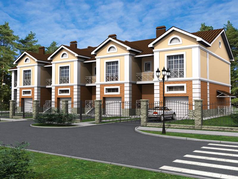 Следующая градация дуплекса – таунхаус. Это полностью благоустроенный малоэтажный дом на несколько квартир. При этом каждая квартира обязательно хотя бы одной стеной соприкасается с соседней. Таких ячеек может быть от трех и более. И каждая имеет собственный выход. Все квартиры в таунхаусе имеют небольшой участок земли. На что-то капитальное не хватит, но машину поставить будет куда