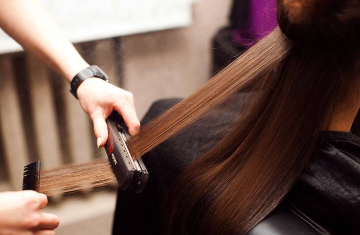 - Горячим утюжком (температура 180-220 о С) тщательно прогревают каждую прядь, чтобы впечатать кератин в структуру волос.