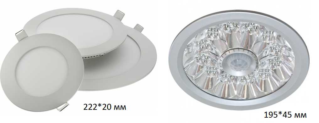 Светодиодные лампы могут иметь совсем маленькие размеры. Кристалл на три вата может быть сделан в виде окружности диаметром в 1,5-2 см. А это — эквивалент энергосберегайки в 7 Вт, которая по минимуму имеет размер 32*79 мм. Такие миниатюрные размеры светодиодов позволяют сделать встраиваемые светильники очень небольшой толщины — 2 см и меньше. И это с радиатором для отведения тепла, которое выделяют светодиоды при работе. Такие небольшие размеры позволяют их встраивать в мебель или опускать подвесные и натяжные потолки на совсем незначительную высоту.