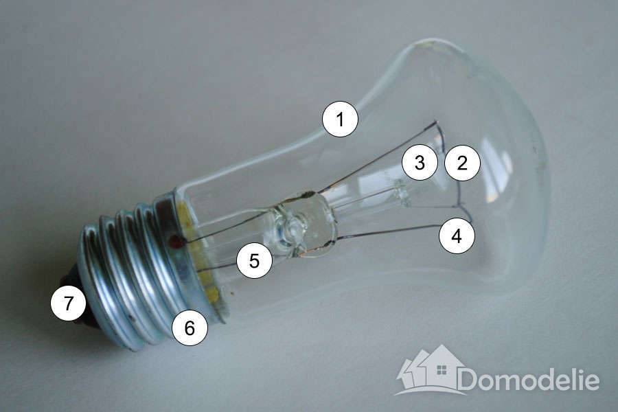 1-колба лампы; 2-тело накала; 3-держатели тела накала; 4-электроды; 5-изолятор цоколя; 6-цоколь; 7-контакт дна цоколя.