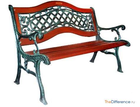 Для начала сравним внешний вид изделий. Лавки представляют собой достаточно простой предмет, состоящий из двух глухих опор и доски между ними. Для изготовления таких изделий обычно используется дерево. Что же касается скамьи, то современные приспособления состоят из нескольких реек и оснащены спинкой. Сиденье покоится на металлических или деревянных ножках, количество которых составляет от четырех до шести штук. Они бывают витыми и нередко украшаются различными декоративными вставками. Многие скамейки дополняются удобными подлокотниками.