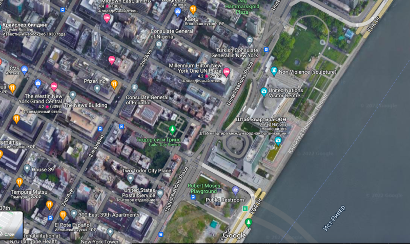 Здания главной штаб-квартиры ООН располагаются в восточной части Манхэттена между 42-й и 48-й улицами, Первой авеню и проливом Ист-Ривер в Нью-Йорке. Площадь участка внутри обозначенного квадрата составляет более 70 тыс. кв. м и является международной зоной, но подчиняется законам США. Кроме зданий в Нью-Йорке у ООН есть три региональных штаб-квартиры в Женеве (Швейцария), Вене (Австрия) и Найроби (Кения).